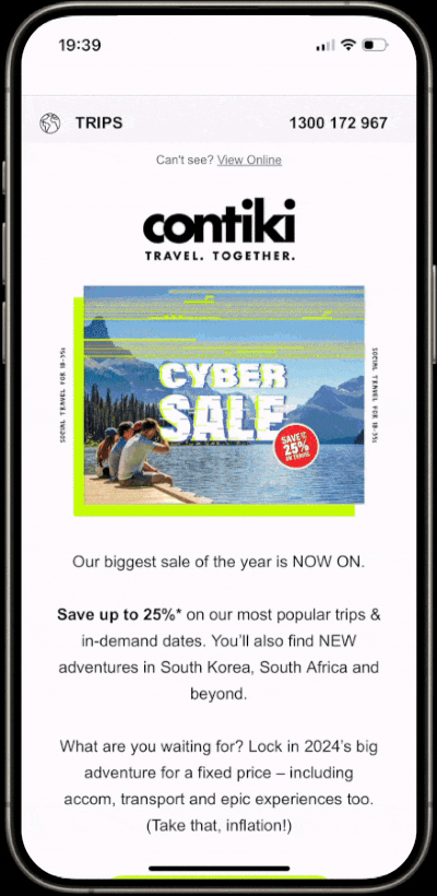 For Contiki’s 2023 Cyber Sale which was during the Black Friday period, I led the creative direction on a campaign that needed to cut through one of the noisiest sales periods of the year. We built a bold “green glitch” visual system inspired by digital-first, game-like environments and rolled it out across 200+ assets for web, social, email, and paid media. Guided by user behavior, the design used oversized typography for impact, countdown elements to build urgency, and modular layouts that flexed across regions. We layered in gamification (“Play to Win”), organic-style TikTok and Instagram content, and destination-led storytelling to balance brand identity with authenticity. The result: a campaign that not only looked different but felt different, driving record-breaking engagement and Contiki’s highest booking day in history.